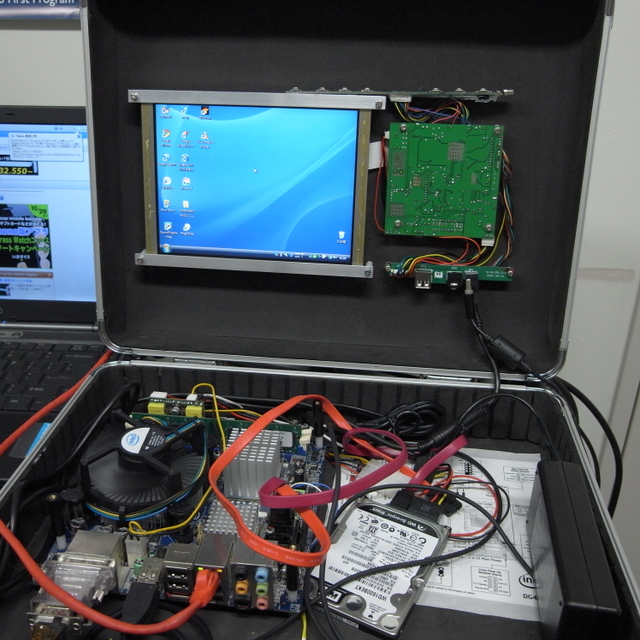 せめて液晶を廃品の9インチアナログVGAじゃなくて、アタッシュケースの蓋を占めるような17インチワイドのノート用液晶+ディスプレイ化キットとかであればネタではなくなるけれど、クロスケーブルでネットブックをつないで遠隔操作するので、起動確認さえ出来ればよかったのでした(完)